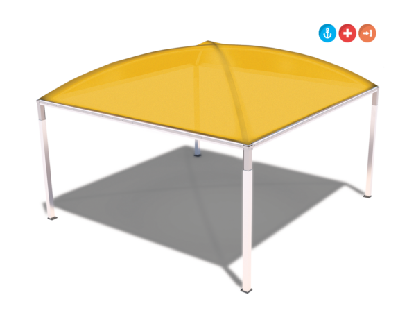 The model is covered with heat, wind and water resistant PVC fabric that cuts UV rays stretched on the square base structure reinforced with two diagonal arches. Supporting structural system is coated by lead free paint.
