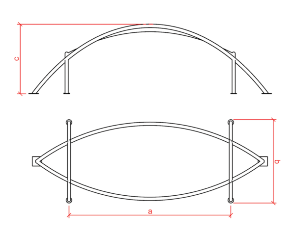 The model consists of several arches on an elliptical base plan. PVC fabric, attached to the supporting arches by forming a saddle shape, blocks UV rays and is resistant to heat, wind and rain.
